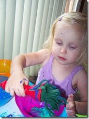 A local parenting group that I am a member of has started a rotating “tot school,” where it is at a different person’s house each week. I was the first to host 2 weeks ago (and of course didn’t take any photos!) and we went to another friend’s house last week. Again, I didn’t take hardly any photos, but here, Ella is sorting pipe cleaners by color into separate containers. She really liked the sparkly purple ones!